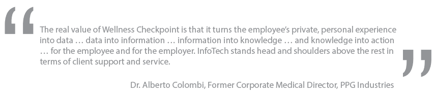 In 1990, InfoTech launched the Wellness Checkpoint and that vision became reality. In the years since, InfoTech has continued to enhance the uniquely powerful Wellness Checkpoint, an “industrial grade” HRA which adapts the experience of risk assessment to the program and business priorities of our clients.