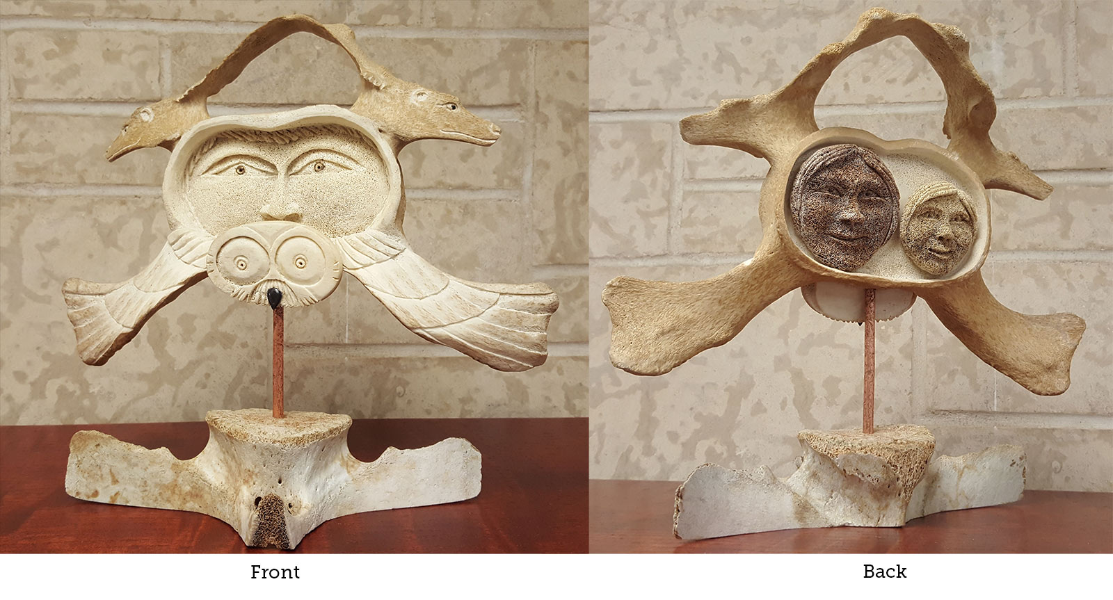 Materials include grey whale bone, beluga whale bone, 19th century glass trade beads & buffalo horn, coming together beautifully to showcase the many faces of the north and the relationships between its people and the land. These items were gathered by members of several local communities from the northernmost regions of Canada, including the beaches and tundra of Baffin Island and the Hudson Bay areas who then gifted them to the artists. As they do with all their art, the artists respected the cultural and environmental freedoms of the people when they incorporated these finds into the sculpture. The artists’ work can be found in galleries around North America and the world.